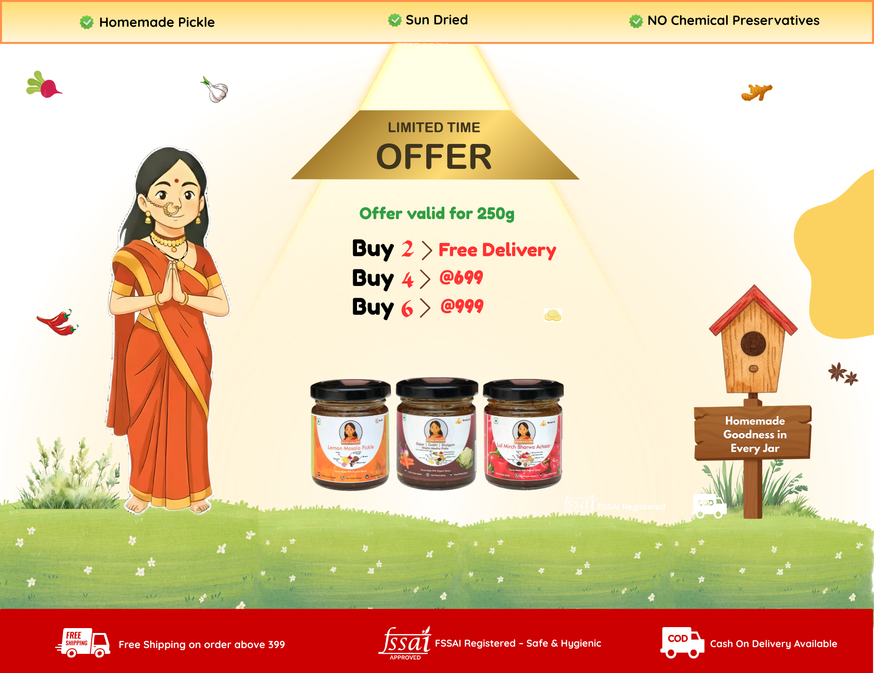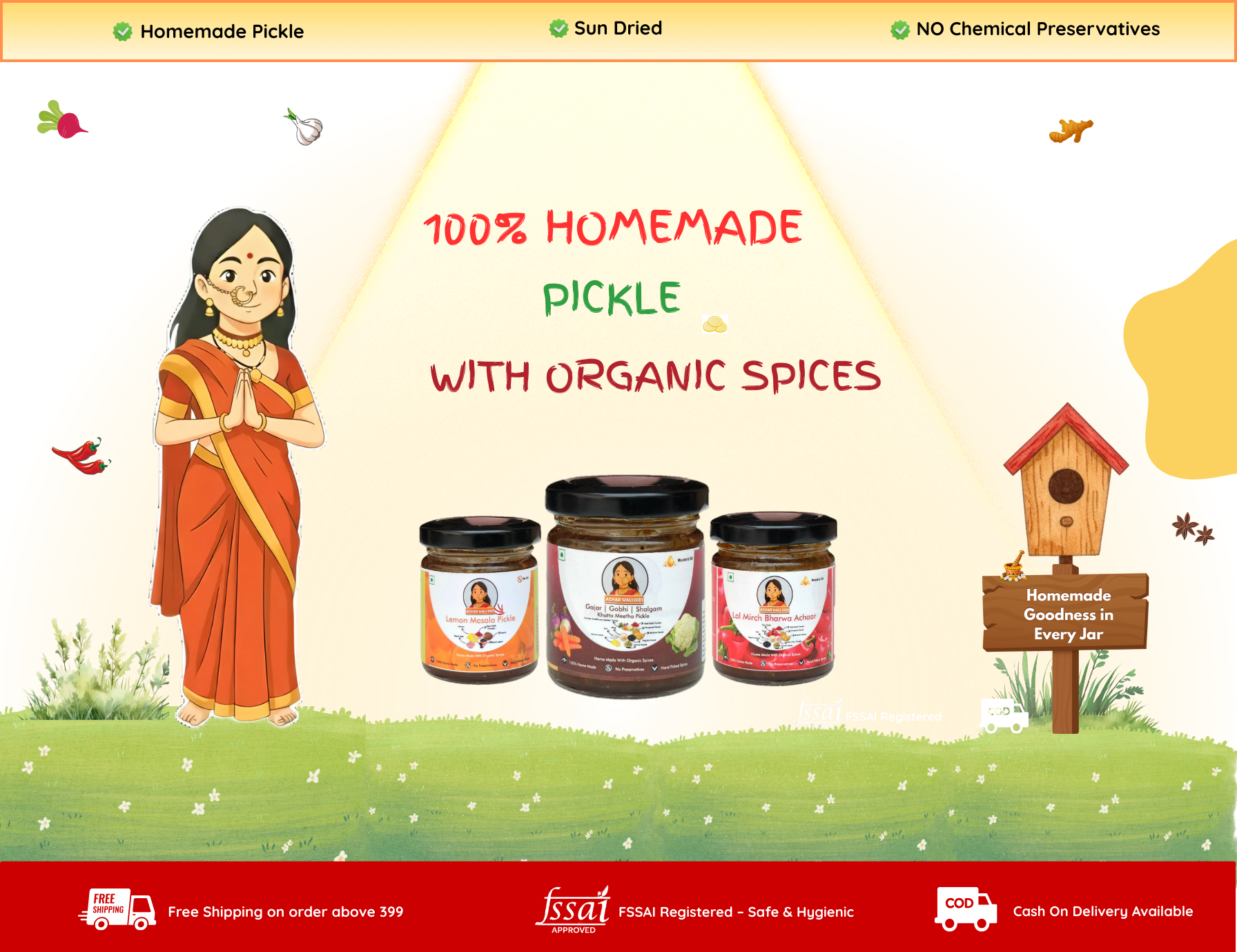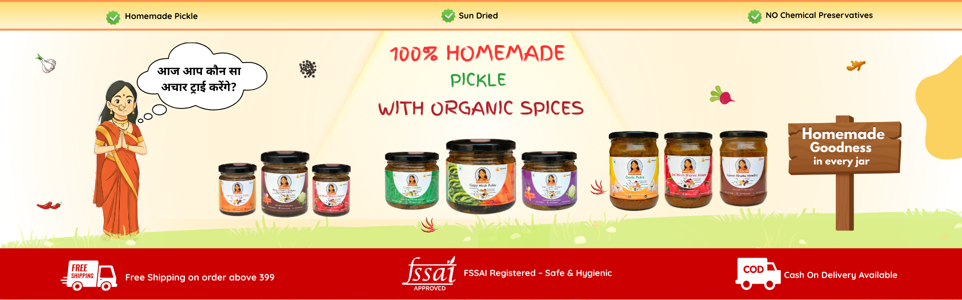 हम हर अचार को पारंपरिक तरीके से बनाते हैं—धूप में सुखाकर, घर में पीसे मसालों से, और बिना किसी प्रिज़र्वेटिव के। हमारी टीम की हर महिला अपने परिवार जैसे प्यार से हर बैच तैयार करती है।