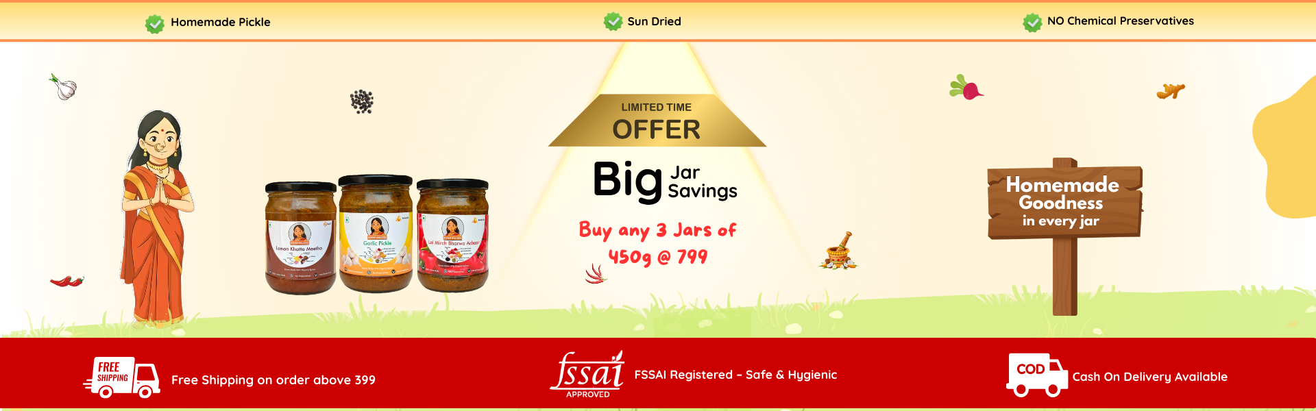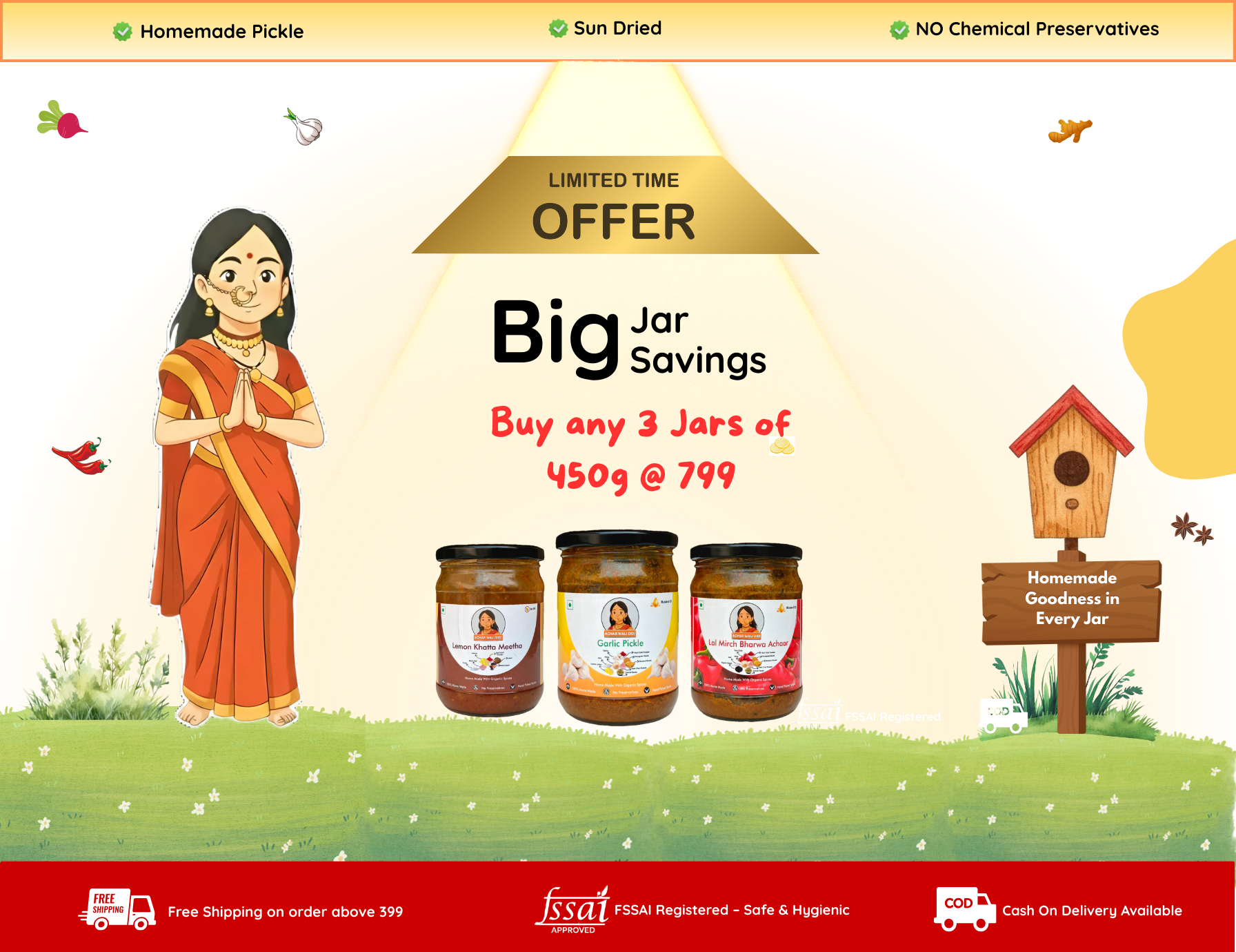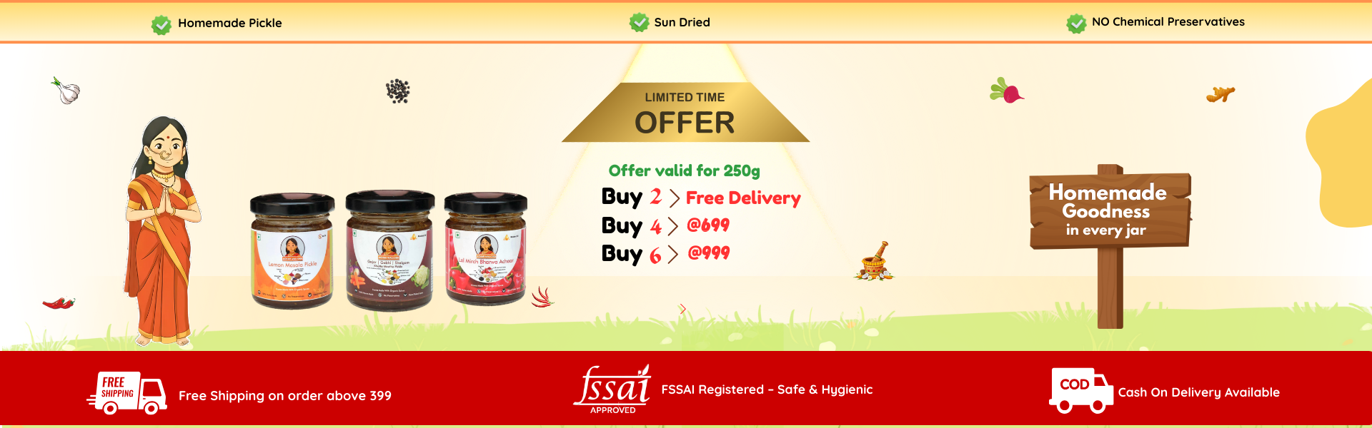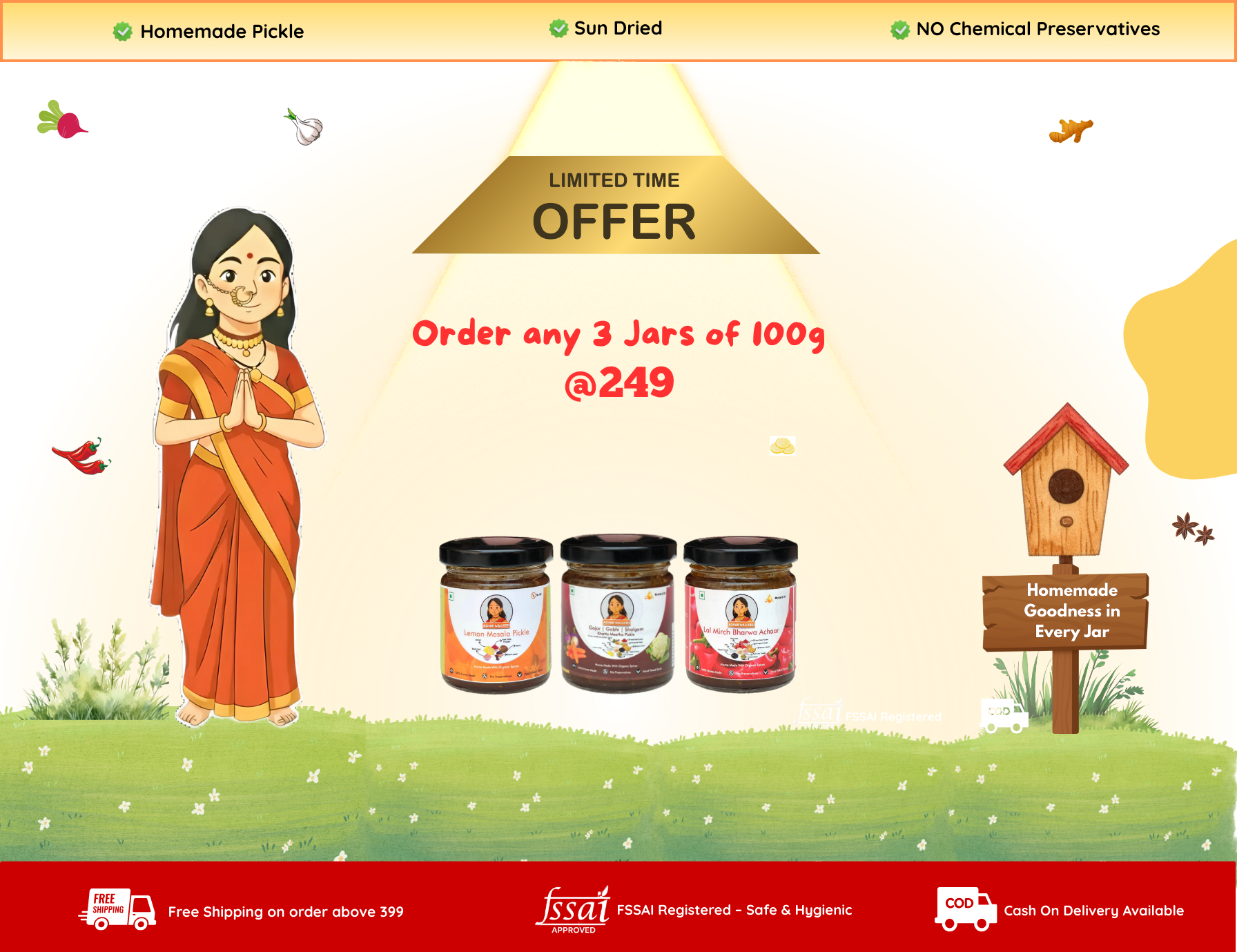 हम हर अचार को पारंपरिक तरीके से बनाते हैं—धूप में सुखाकर, घर में पीसे मसालों से, और बिना किसी प्रिज़र्वेटिव के। हमारी टीम की हर महिला अपने परिवार जैसे प्यार से हर बैच तैयार करती है।