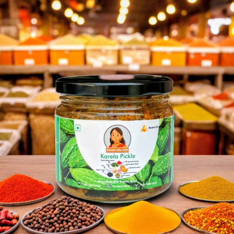 Karela, Mustard Oil, Fenugreek, Fennel, Mustard Seeds, Turmeric, Red Chilli, Himalayan Salt, and traditional Indian spices.